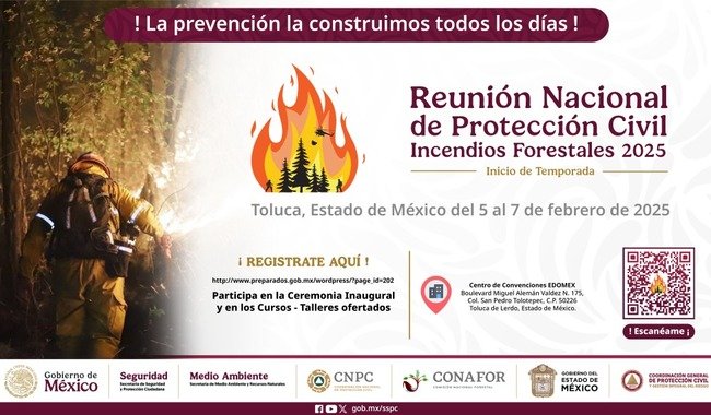 La Reunión Nacional de Protección Civil de la Temporada de Incendios Forestales 2025 se realizará del 5 al 7 de febrero en el Estado de México, con el respaldo de las autoridades de la entidad. Para más información, te invitamos a consultar la siguiente liga: preparados.gob.mx