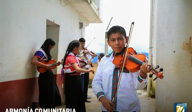 Canal 22, institución de la Secretaría de Cultura del Gobierno de México, en coproducción con el Consejo Nacional de Fomento Educativo (CONAFE) —organismo de la Secretaría de Educación Pública (SEP) que brinda servicios de educación comunitaria a primeras infancias y adolescentes que habitan en localidades de alta marginación—, preparan cuerdas y violines para presentar en pantalla el documental Armonía Comunitaria: una producción propia que muestra a las niñas y los niños de una comunidad nahuablante de la sierra norte de Puebla que se inician en el arte sonoro.