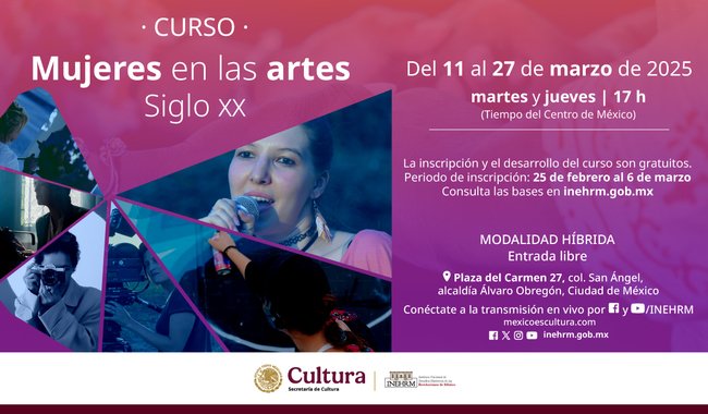 Para destacar la actividad, el legado y las contribuciones artísticas, culturales y sociales de las mujeres, el Instituto Nacional de Estudios Históricos de las Revoluciones de México (INEHRM), organismo de la Secretaría de Cultura del Gobierno de México, convoca al curso “Mujeres en las artes. Siglo XX”, que se llevará a cabo durante marzo de 2025 en el marco del Día Internacional de la Mujer.