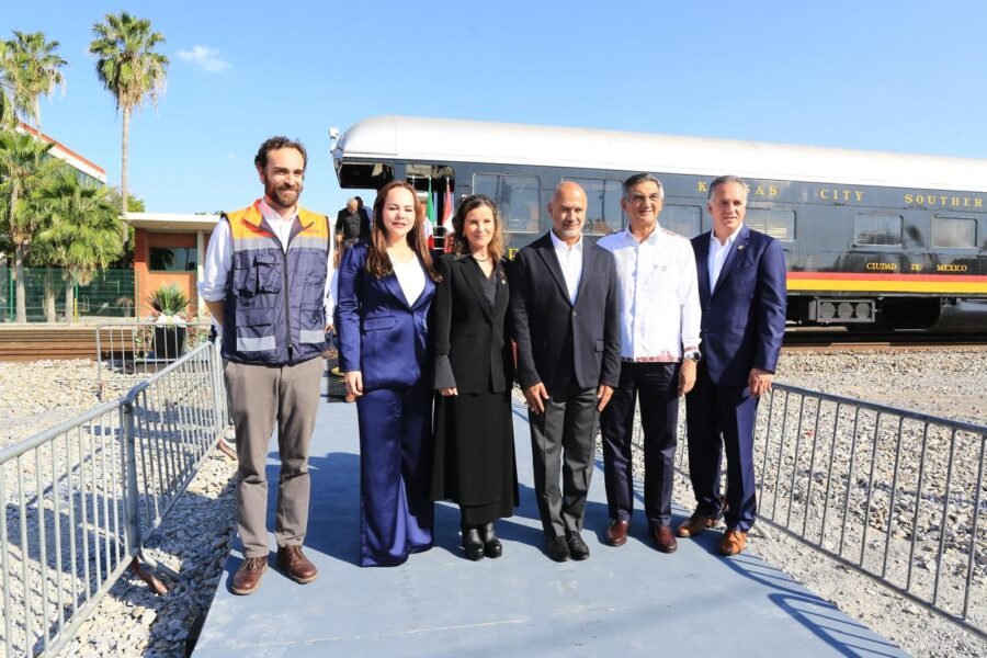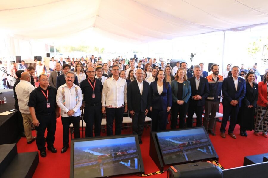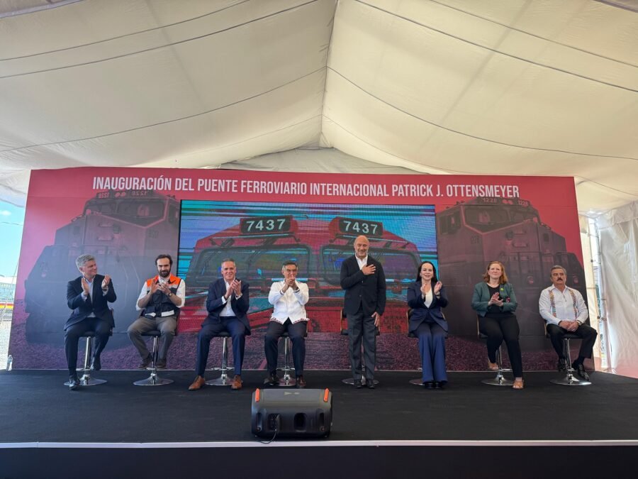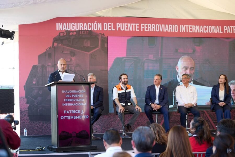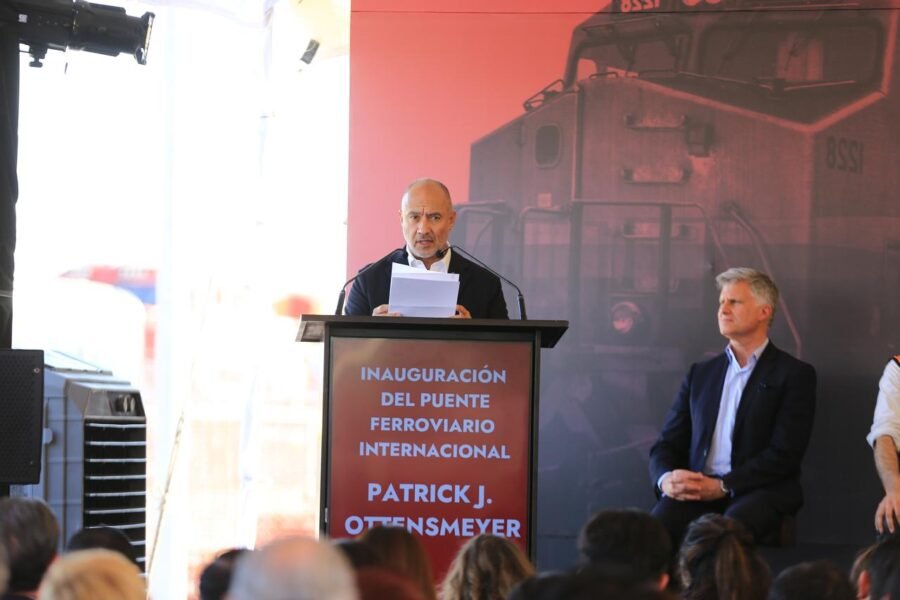 «Esta inauguración es de gran relevancia por su importancia comercial y por el simbolismo que tiene», señaló Jesús Esteva ante el presidente de Canadian Pacific Kansas City (CPKC), Óscar del Cueto Cuevas y el gobernador de Tamaulipas, Américo Villarreal Anaya, al citar palabras de la Presidenta de la República.