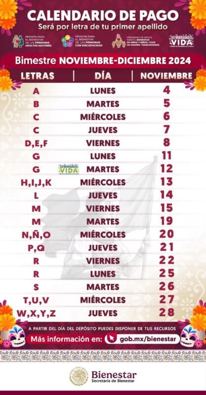 Explicó que para el bimestre noviembre- diciembre, derechohabientes y beneficiarios recibirán el pago de la pensión o programa de manera directa y sin intermediarios a través de la tarjeta del Banco del Bienestar. Para brindar mejor atención, la dispersión se realizará de acuerdo con la letra inicial del primer apellido, por lo que no es necesario acudir antes de la fecha programada, ya que el recurso estará disponible a partir del día señalado en el siguiente calendario.