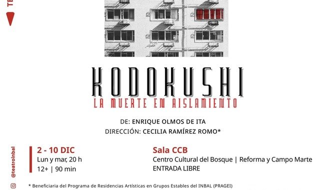 La Secretaría de Cultura del Gobierno de México y el Instituto Nacional de Bellas Artes y Literatura (INBAL), a través de la Coordinación Nacional de Teatro y Espectro escénico, presentan Kodokushi. La muerte en aislamiento, escrita por Enrique Olmos de Ita, bajo la dirección de Cecilia Ramírez Romo. Esta obra ofrecerá funciones del 2 al 10 de diciembre: lunes y martes a las 20 h, en la Sala CCB del Centro Cultural del Bosque. Entrada libre.