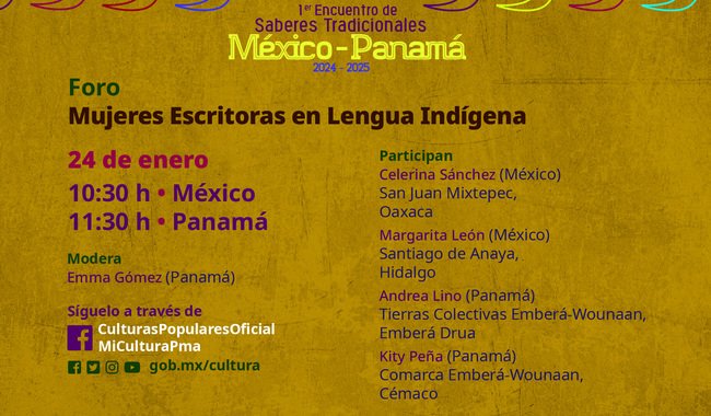 La Secretaría de Cultura del Gobierno de México, a través de la Dirección General de Culturas Populares, Indígenas y Urbanas (DGCPIU), en colaboración con el Ministerio de Cultura de Panamá, invita a todas las personas interesadas en conocer más sobre el tema de creación literaria en lengua materna, desde una perspectiva de género, a seguir la mesa de diálogo “Mujeres escritoras hablantes de lenguas indígenas”.