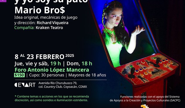 El Centro Nacional de las Artes (CENART), institución de la Secretaría de Cultura del Gobierno de México, presenta la obra Dios juega videojuegos y yo soy su puto Mario Bro$: una pieza interactiva de Richard Viqueira, ganador en 2022 en la categoría de Mejor Teatro de Búsqueda en los Premios APT (de la Agrupación de Periodistas Teatrales), quien creó un juguete escénico sadomasoquista donde el público jugará y manipulará a los actores. Tendrá funciones del 8 al 23 de febrero en el Foro Antonio López Mancera.