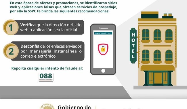 Durante el periodo vacacional por temporada decembrina, la Secretaría de Seguridad y Protección Ciudadana (SSPC), a través de la Dirección General de Gestión de Servicios, Ciberseguridad y Desarrollo Tecnológico, alerta a la ciudadanía sobre sitios web y aplicaciones falsas que ofrecen servicios de hospedaje, y emite recomendaciones para evitar ser víctimas de fraude.