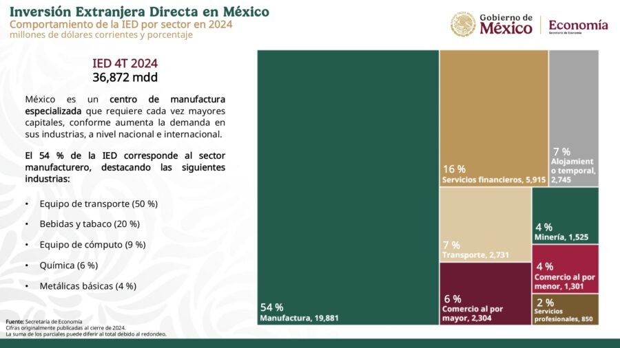 Registrarse ¡Bienvenido! Ingresa en tu cuenta tu nombre de usuario tu contraseña ¿Olvidaste tu contraseña? consigue ayuda Recuperación de contraseña Recupera tu contraseña tu correo electrónico Se te ha enviado una contraseña por correo electrónico. InicioSecretarias09 Secretaría de EconomíaMéxico recibió 36 mil 872 mdd de IED, nuevo máximo histórico 09 Secretaría de EconomíaGob. de Méx México recibió 36 mil 872 mdd de IED, nuevo máximo histórico By Noticiero Gubernamental febrero 25, 2025 0 46 Cuota FacebookTwitterPinterestLinkedinWhatsAppTelegram Inversión Extranjera Directa en México – Cuarto trimestre 2024 Secretaría de Economía | 25 de febrero de 2025 IED en México – Cuarto trimestre 2024 Descarga el documento completo aquí Cuota FacebookTwitterPinterestLinkedinWhatsAppTelegram Artículo anteriorEntrevista del secretario de Economía, Marcelo Ebrard, al término de la inauguración del Códex AlimentariusArtículo siguienteEl Gabinete de Seguridad del Gobierno de México informa acciones relevantes del lunes 24 de febrero 2025 Noticiero Gubernamental RELATED ARTICLES 14 Secretaría de Marina La Secretaría de Marina impulsa derechos, igualdad y empoderamiento en el “Día Internacional de las Mujeres 2025” marzo 8, 2025 18 Secretaría de Salud 048. México tiene capacidad e infraestructura para mejorar coberturas de vacunación y ser ejemplo para otros países: OPS marzo 7, 2025 17 Secretaría de Relaciones Exteriores Las secretarías de Relaciones Exteriores y de las Mujeres, junto con el INPI y el CONAPRED, conmemoran el Día Internacional de las Mujeres marzo 7, 2025 - Advertisment - Most Popular La Secretaría de Marina impulsa derechos, igualdad y empoderamiento en el “Día Internacional de las Mujeres 2025” marzo 8, 2025 048. México tiene capacidad e infraestructura para mejorar coberturas de vacunación y ser ejemplo para otros países: OPS marzo 7, 2025 Las secretarías de Relaciones Exteriores y de las Mujeres, junto con el INPI y el CONAPRED, conmemoran el Día Internacional de las Mujeres marzo 7, 2025 El sector ambiental federal avanza para alcanzar la igualdad sustantiva: Alicia Bárcena marzo 7, 2025 Cargar más Recent Comments