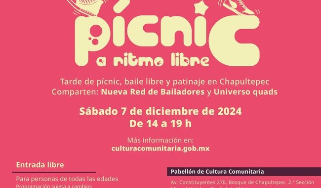 Con el objetivo de propiciar un espacio de convivencia comunitaria y expresión artística, la Secretaría de Cultura del Gobierno de México invita al público en general a participar en un evento de baile libre y pícnic en el Pabellón de Cultura Comunitaria, el sábado 7 de diciembre de 2024 a partir de las 14:00 h.